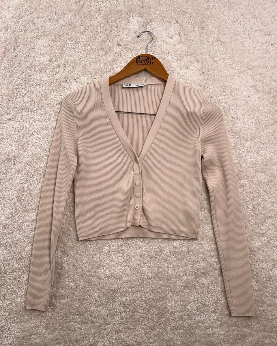 Ribbed Cropped Cardigan in Light Beige-Size: M