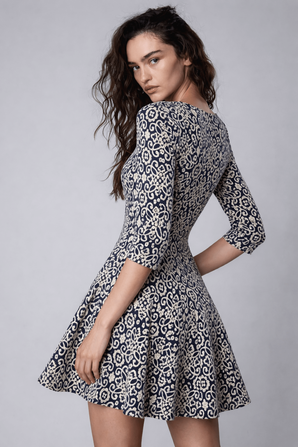 Flared Jacquard Mini Dress in Blue and Cream- Size: S/M