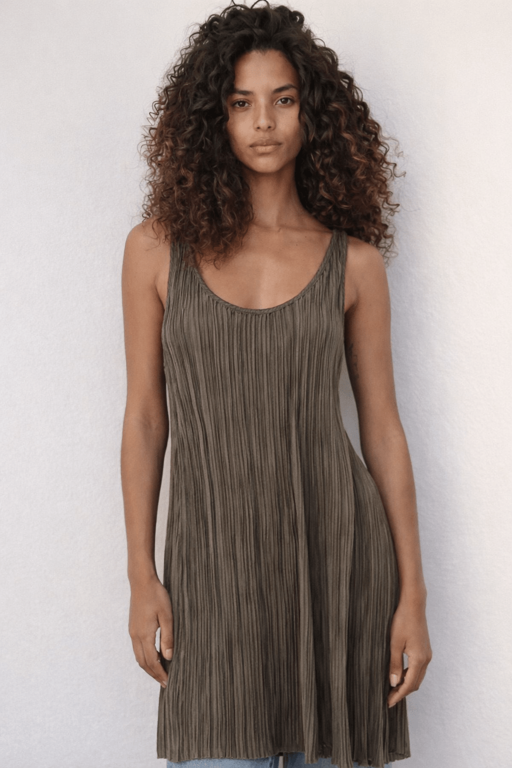 Pleated Jersey Mini Dress in Olive Green- Size: XS