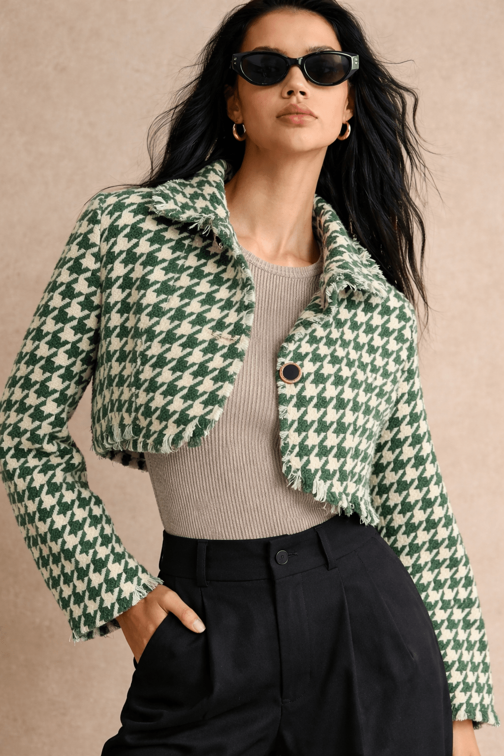 Cropped Houndstooth Jacket in Green and White- Size: XL