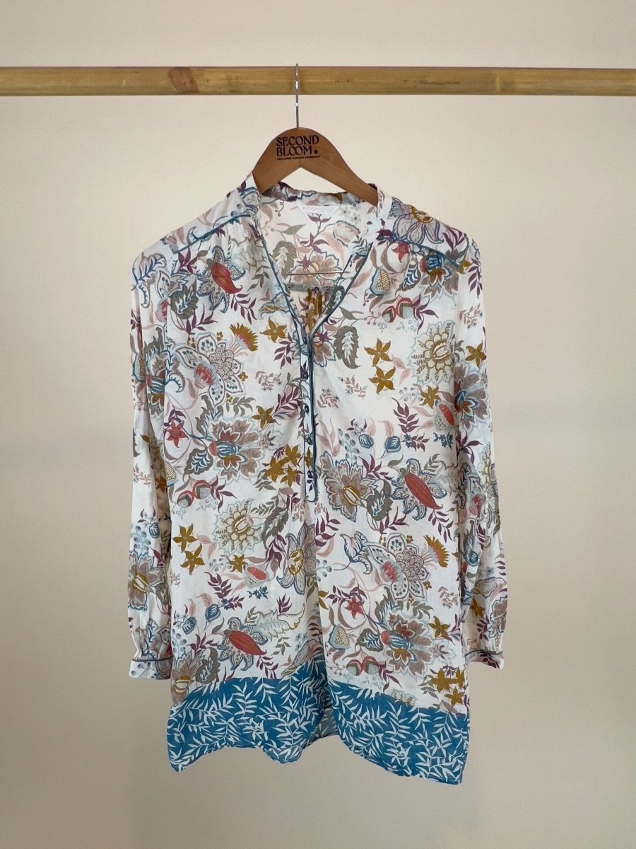 Boho Floral Blouse/Tunic with Teal Blue Border - Size: M