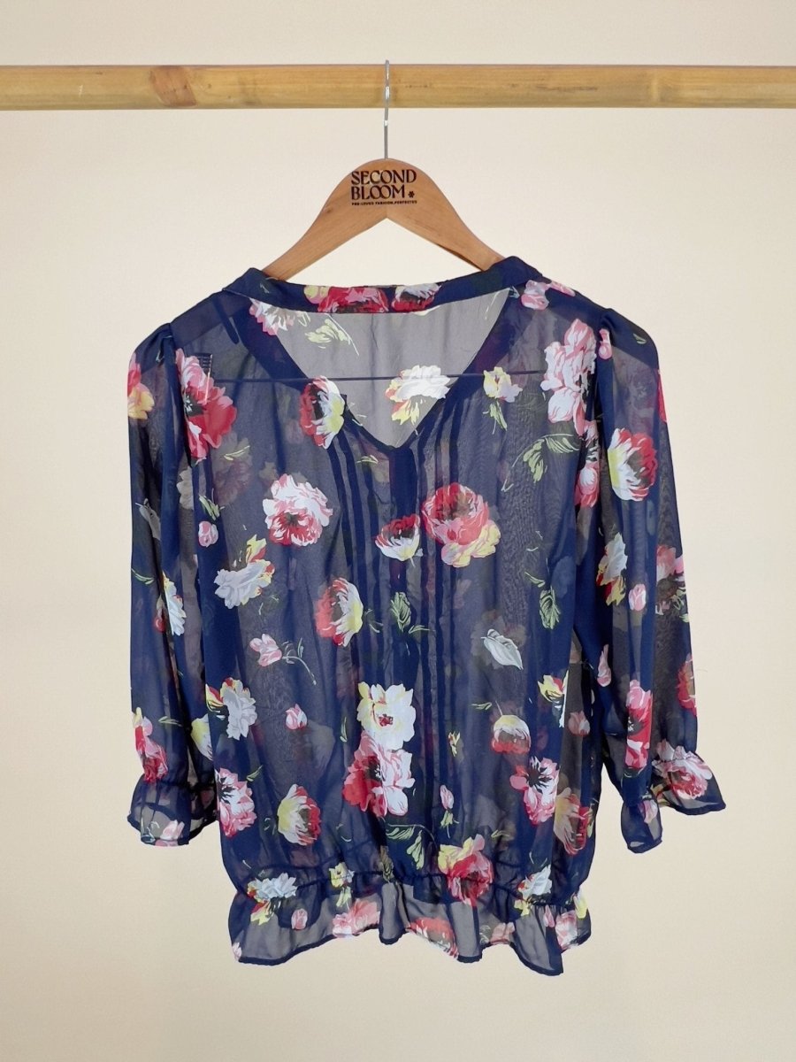 Deep Navy Blouse with all-over Floral Print - Size: M