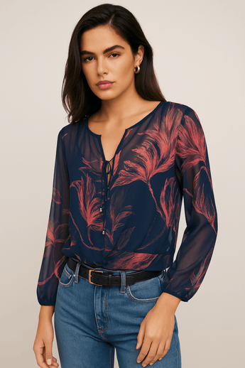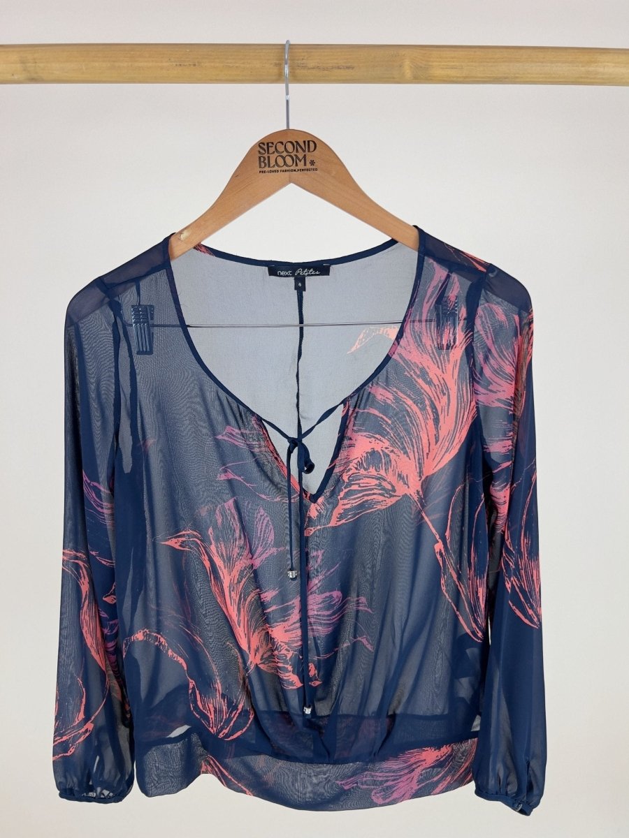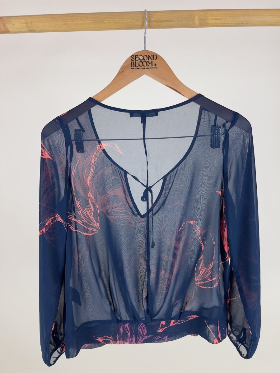 Sheer Navy Blouse with Vibrant Floral Print- Size: S