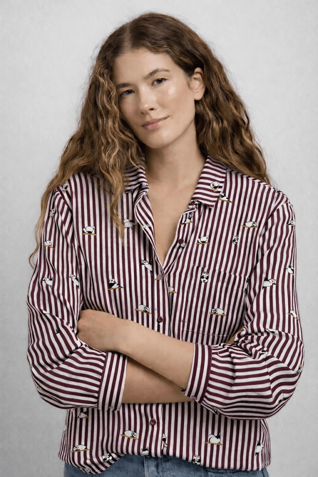 Brown Striped Shirt with Bear Print-Size: S