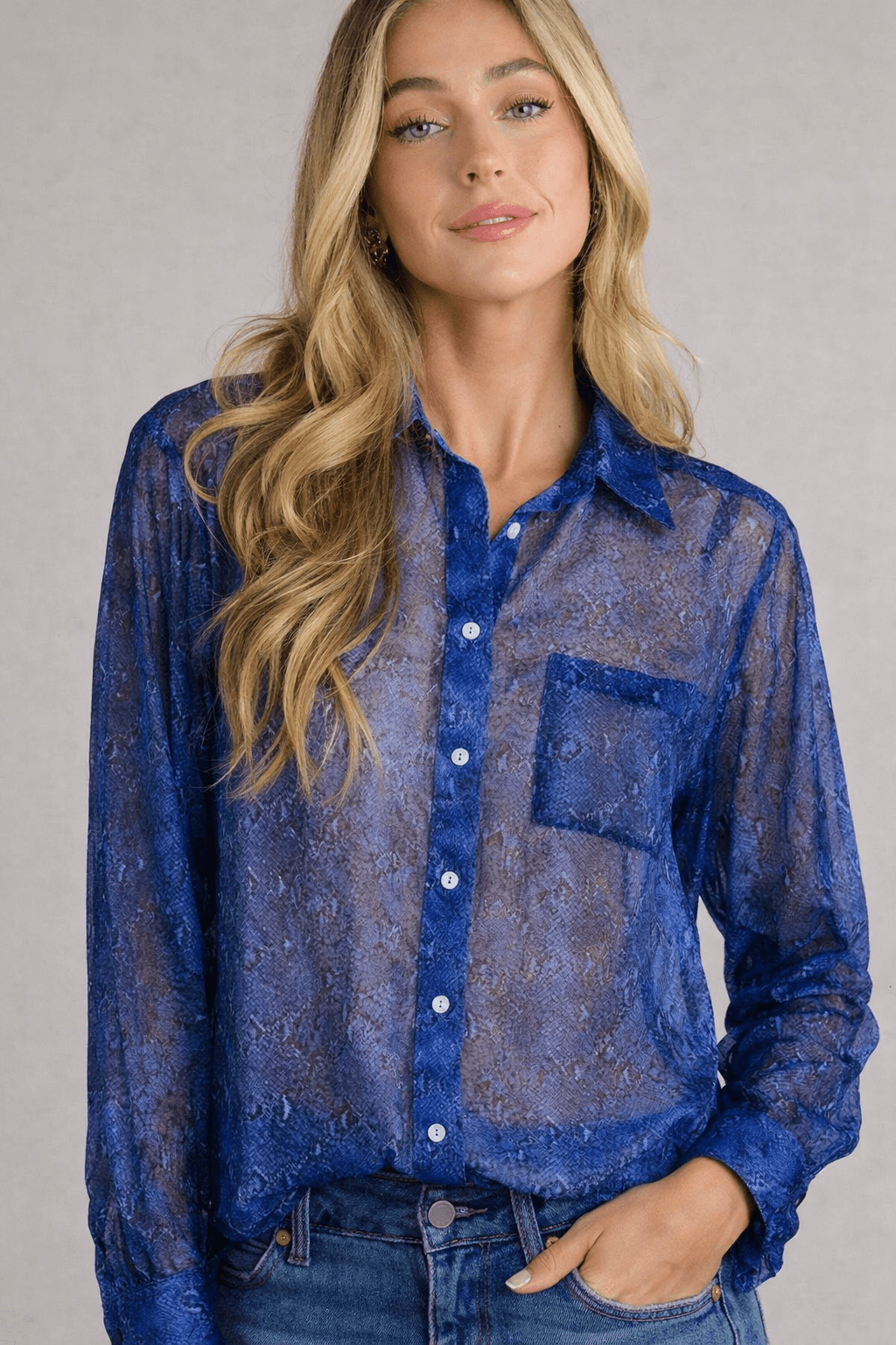 Cobalt Blue Blouse with jacquard-like Pattern - Size: S