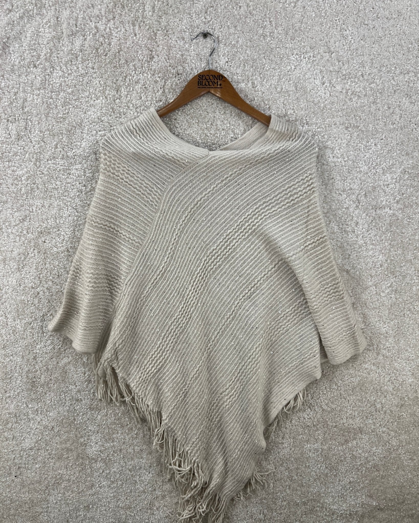 Sequin Decorated Fringe Poncho in Cream - Size: One Size